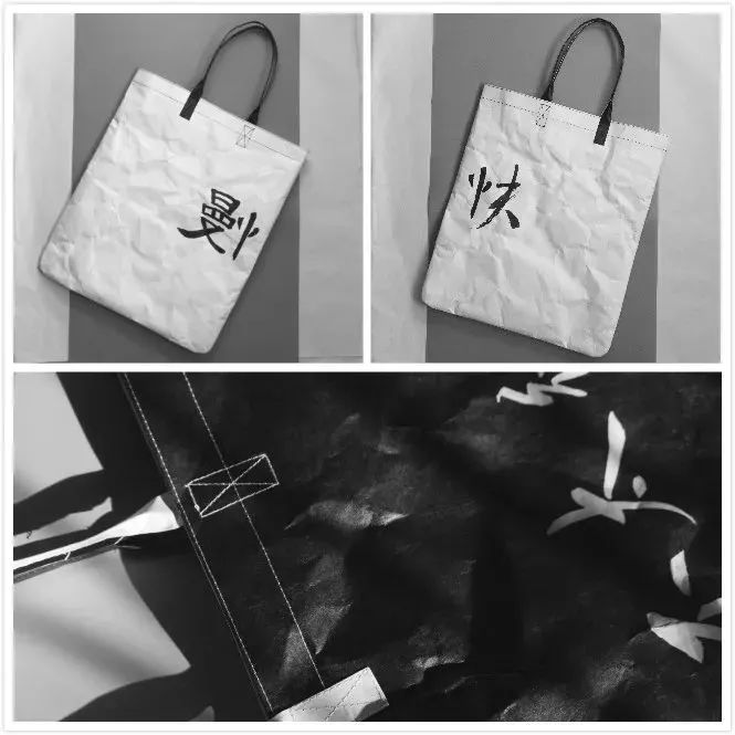 Tyvek? 特殊的紙感讓設(shè)計師聯(lián)想到了文字。為了充分體現(xiàn)漢字的魅力,并呼應(yīng)Tyvek? 的紙質(zhì)特性,所有文字和圖樣均由設(shè)計師手寫并掃描而成,保留了書法墨跡在宣紙上的獨特效果。整個系列的文字內(nèi)容選擇了三組反義詞和三組潛臺詞,兼具嚴(yán)肅與詼諧,為不同人群需求提供豐富的選擇。