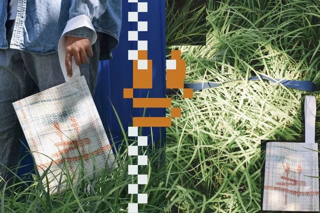 設(shè)計主要從編織袋材料質(zhì)感印制到Tyvek? 材料上的沖突感和矛盾感入手,著重表現(xiàn)了編織袋的紋理與光澤,并從編織造成的格子肌理出發(fā),創(chuàng)造像素風(fēng)的圖樣。圖樣主要以輕松愉快與些許懷舊感為主。