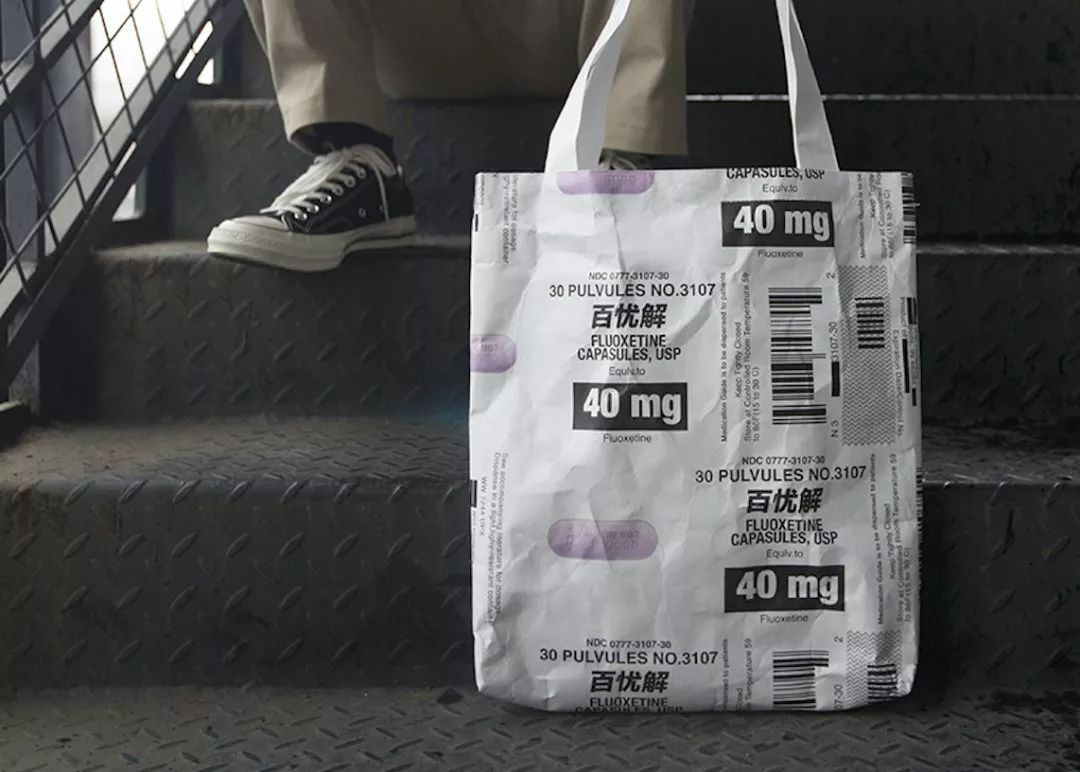 百憂解是一種抗抑郁的藥物,設(shè)計師從網(wǎng)絡(luò)“喪文化”提取關(guān)鍵信息,印刻在藥丸圖案上,表現(xiàn)年輕人對現(xiàn)實生活的一種自嘲態(tài)度。